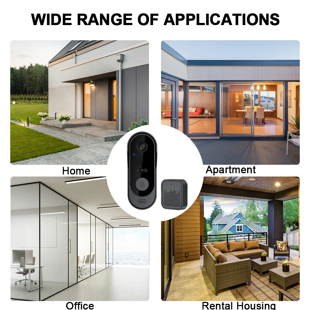 Feature: 1. Durable and Reliable: The wireless video doorbell with chime features a waterproof design, ensuring it works flawlessly in all weather conditions, adding to the device’s durability and reliability. 2. Wide-Angle Coverage: Enjoy a broad field of view with the smart video doorbell camera, providing comprehensive coverage of your surroundings to enhance home security. 3. Enhanced Night Vision: The wireless visual intercom doorbell is equipped with LED night vision, ensuring clear visibility even in low light or complete darkness, keeping your home safe at all times. 4. Crystal Clear HD Imaging: The smart visual doorbell comes with a high-definition camera, delivering crisp and detailed outdoor images for perfect clarity and peace of mind. 5. Long-Lasting Battery Life: The intelligent doorbell is upgraded with a 1000mAh high-capacity battery, ensuring extended usage time and reliability for continuous monitoring. Specification: