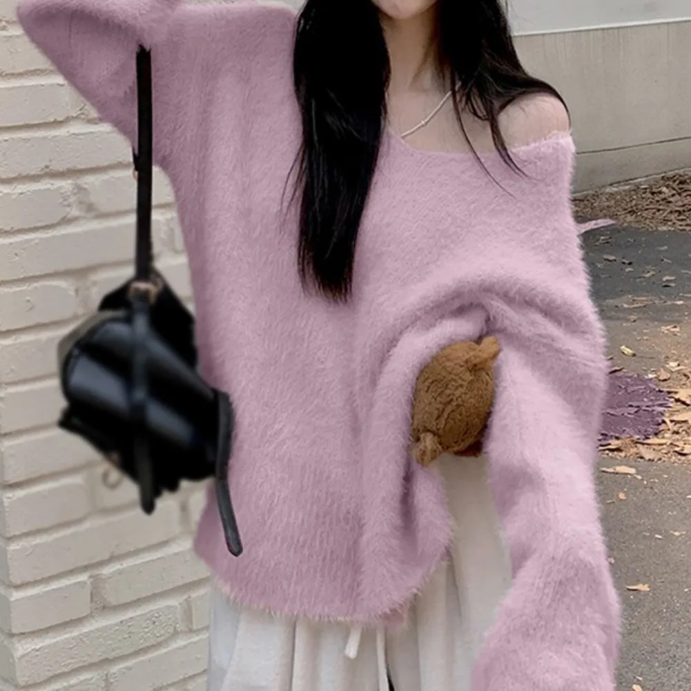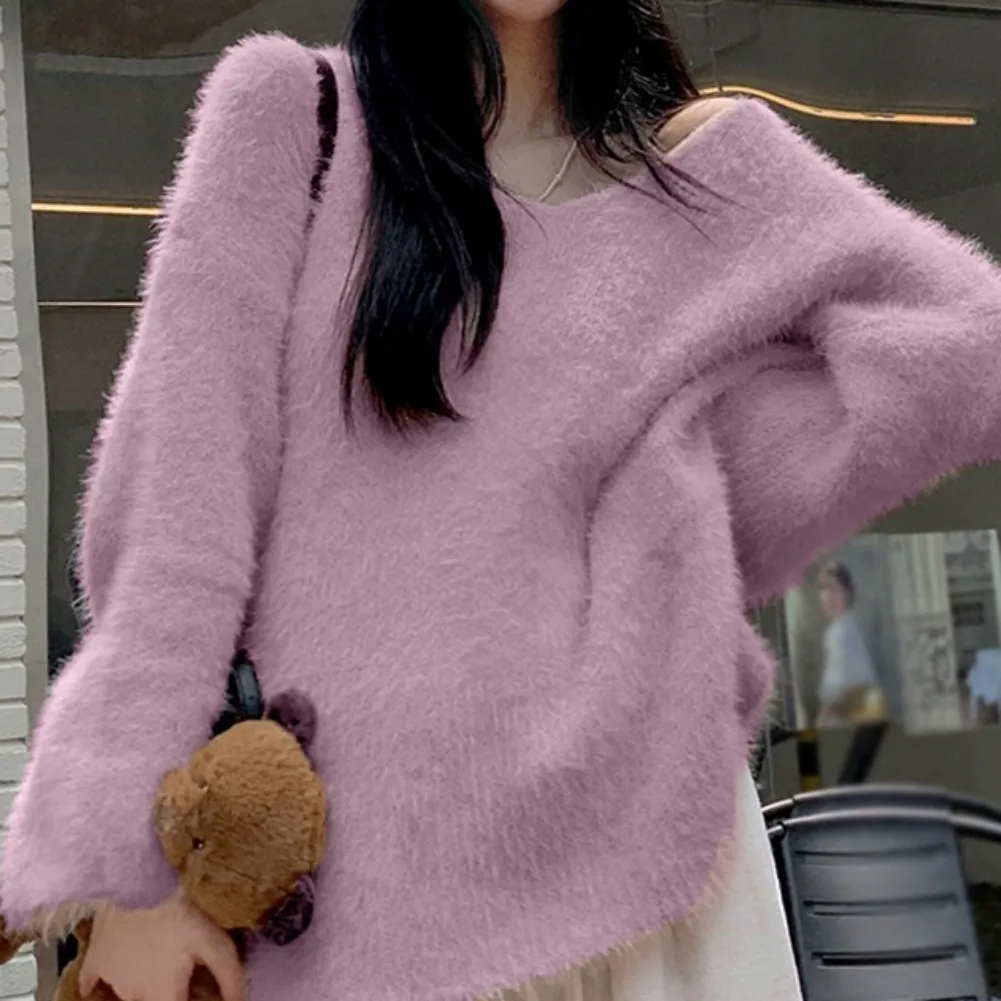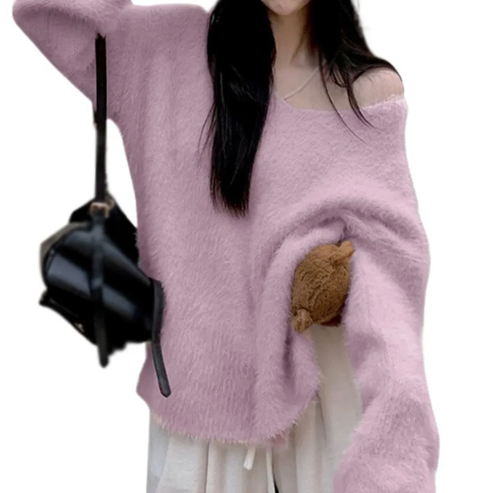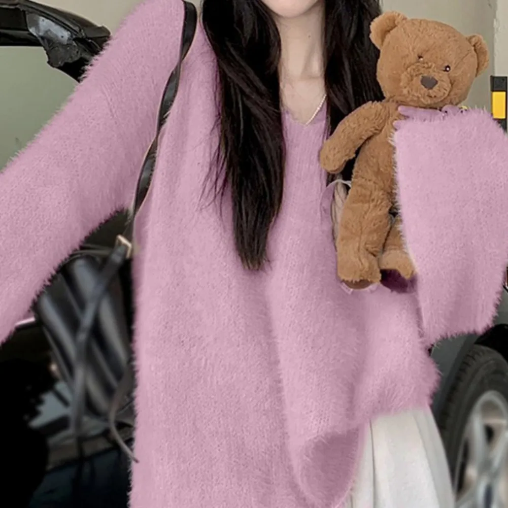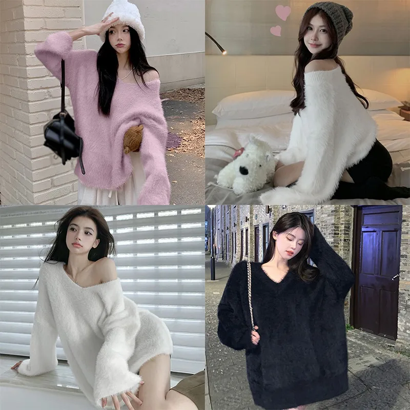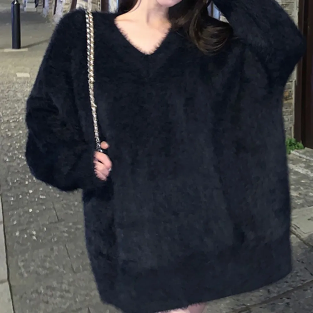 Features: slouchy, soft sticky, gentle sweater, top, autumn and winter, pullover, loose V-neck, mid-length, women’s