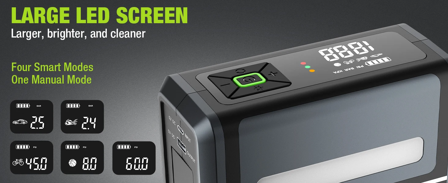 1. Digital large screen: real-time display of current tire pressure, preset tire pressure, usage mode, battery capacity,