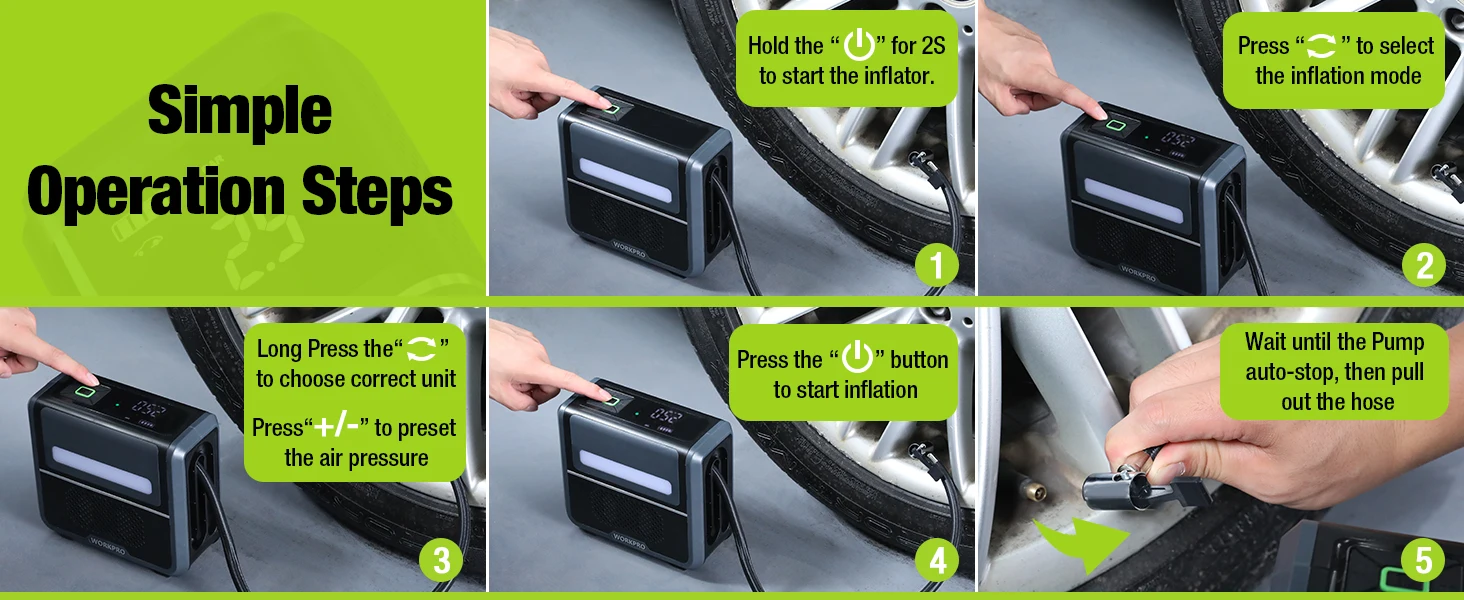 Free mode: Default 3-150PSI, adjustable range 0.2-10.3Bar, preset tire pressure automatic charging and stopping