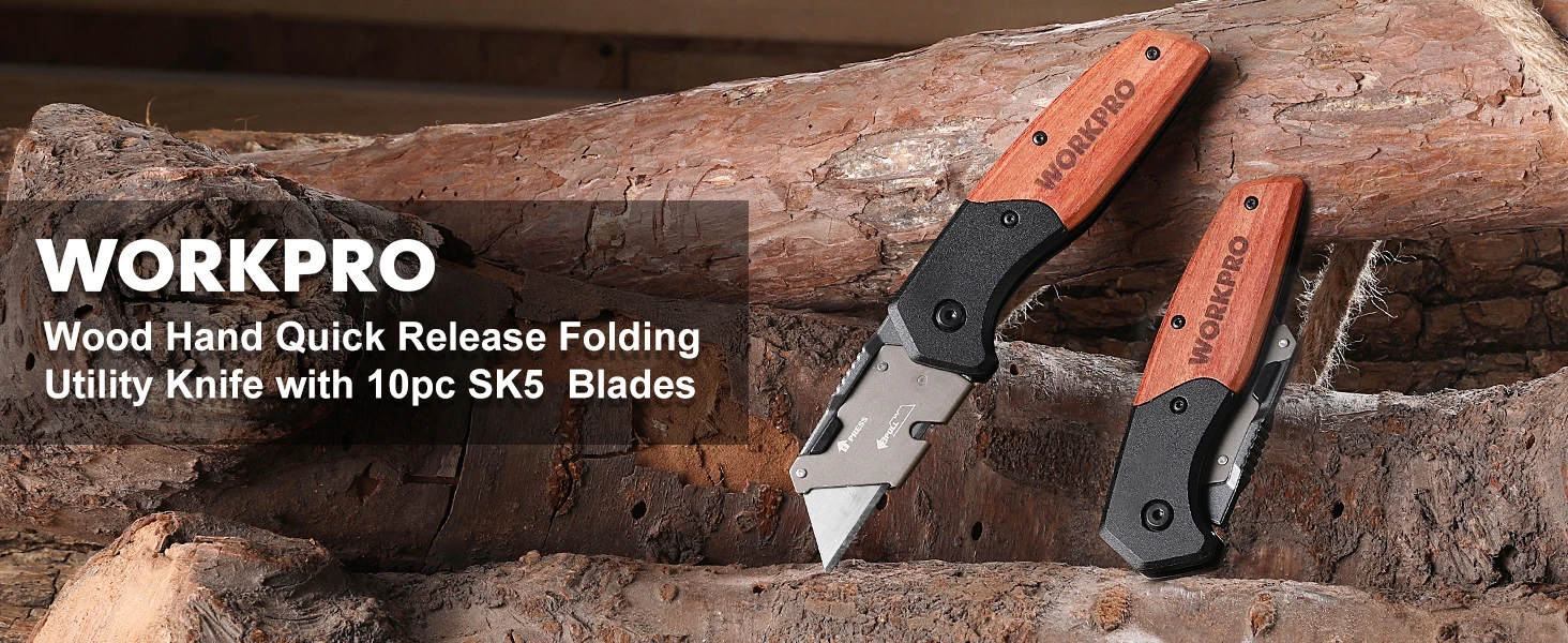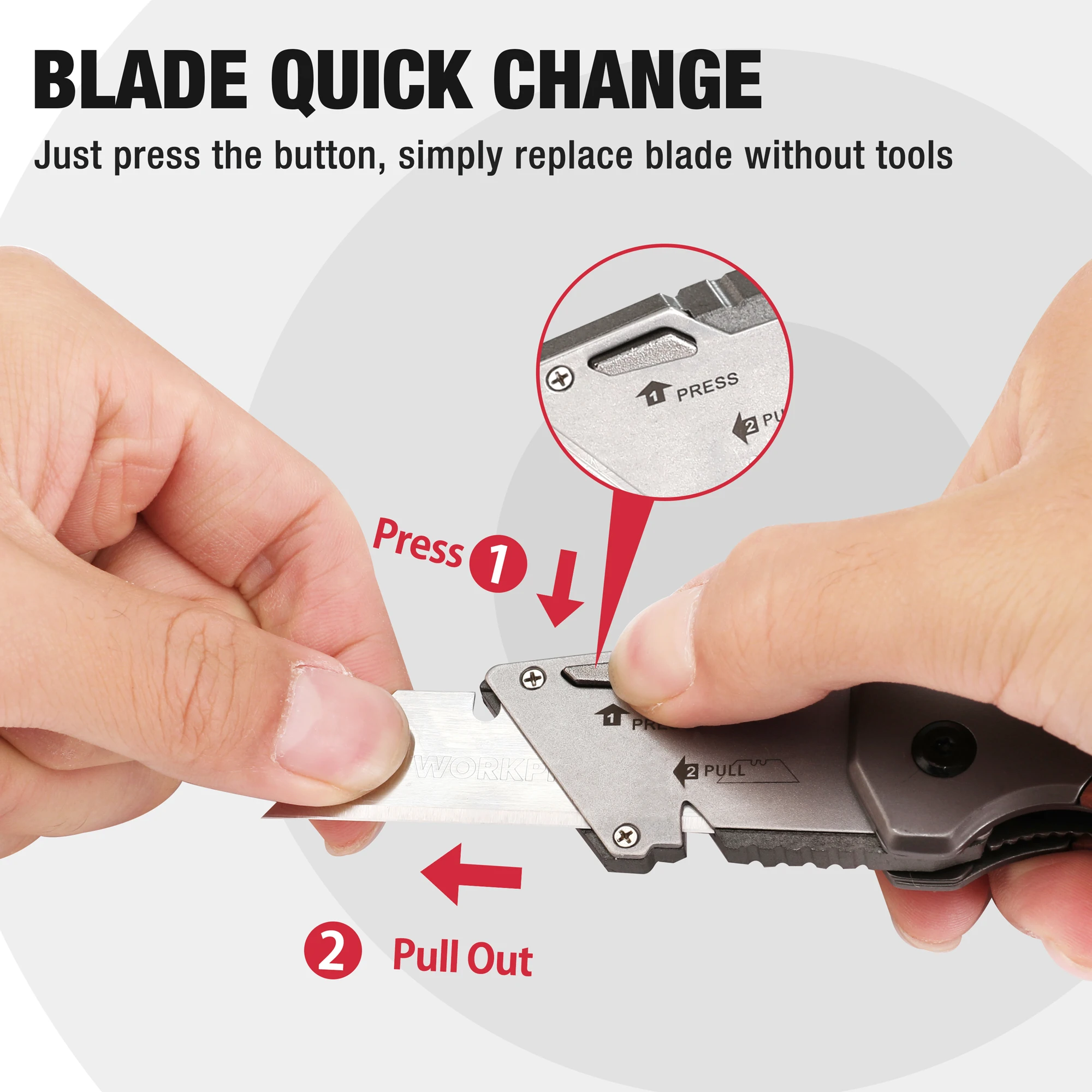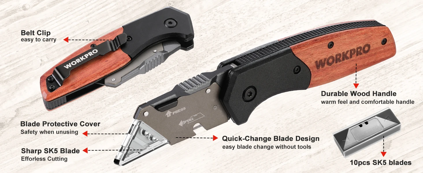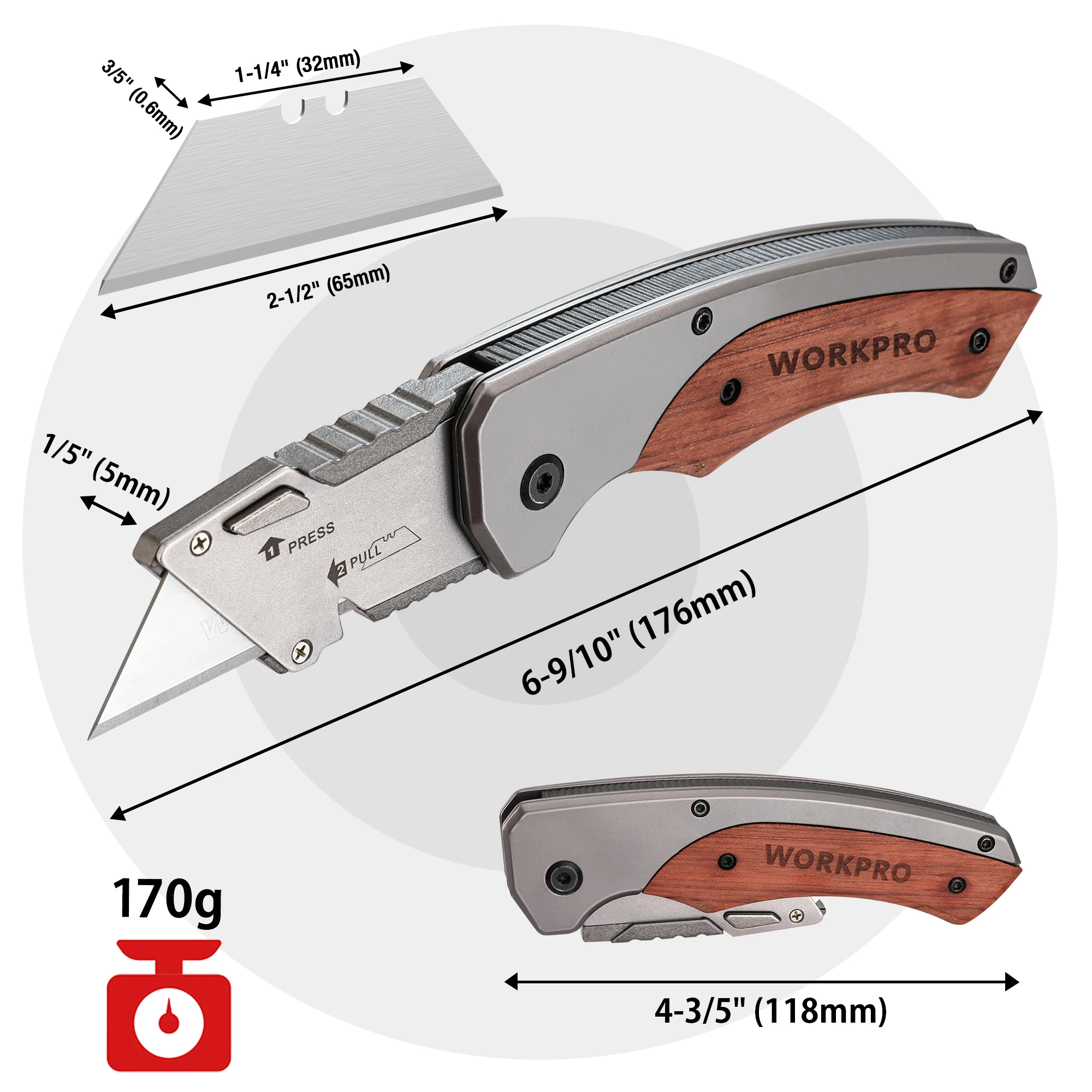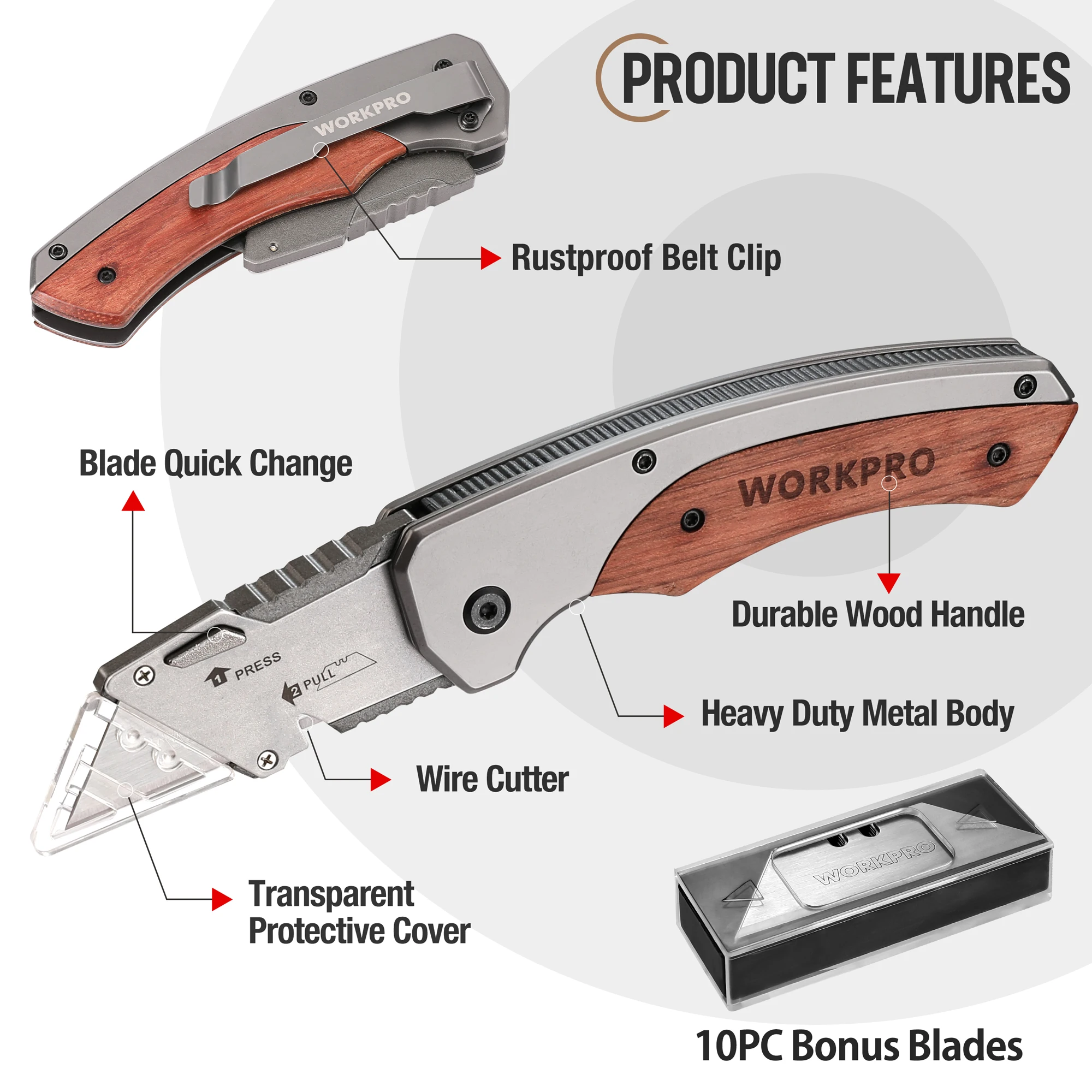 WORKPRO Folding Knife Replaceable Utility Knife for Cable Cartons Carboard Boxes Cutter Handle Knife 10 Pcs Blades OutdoorTool