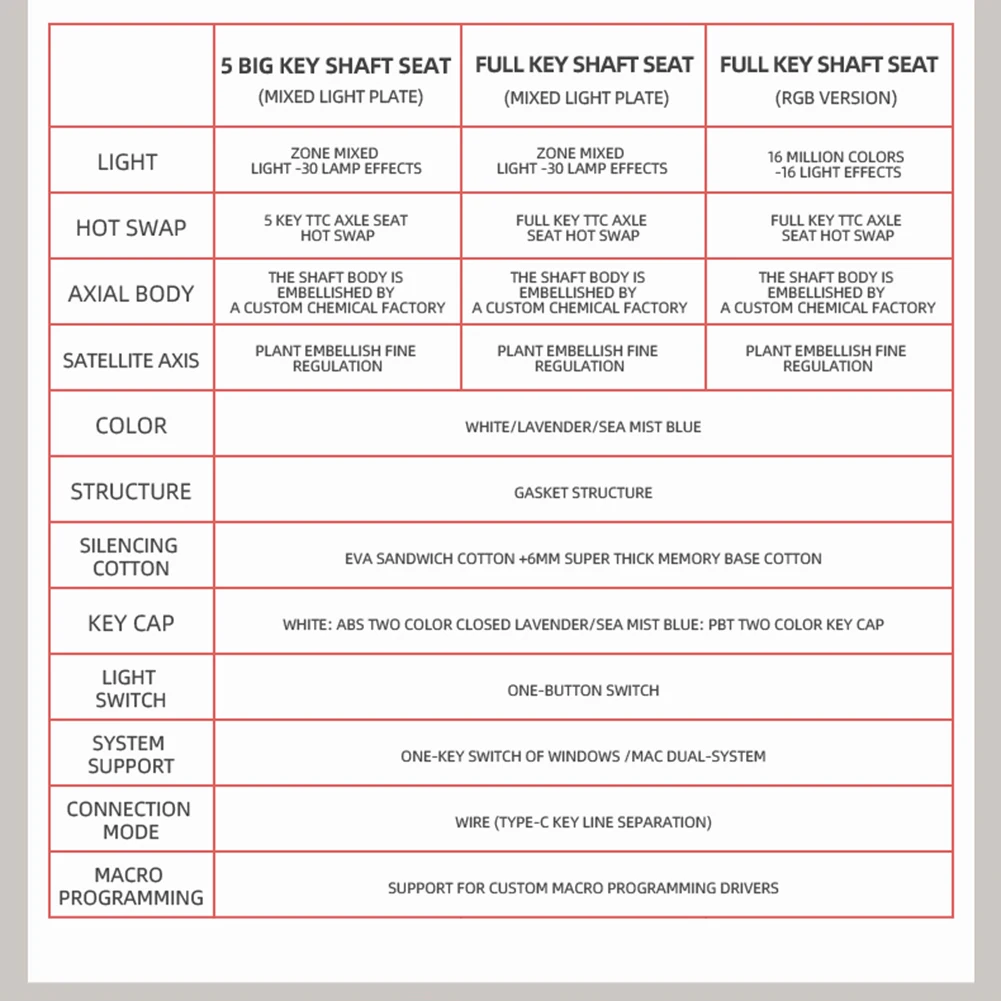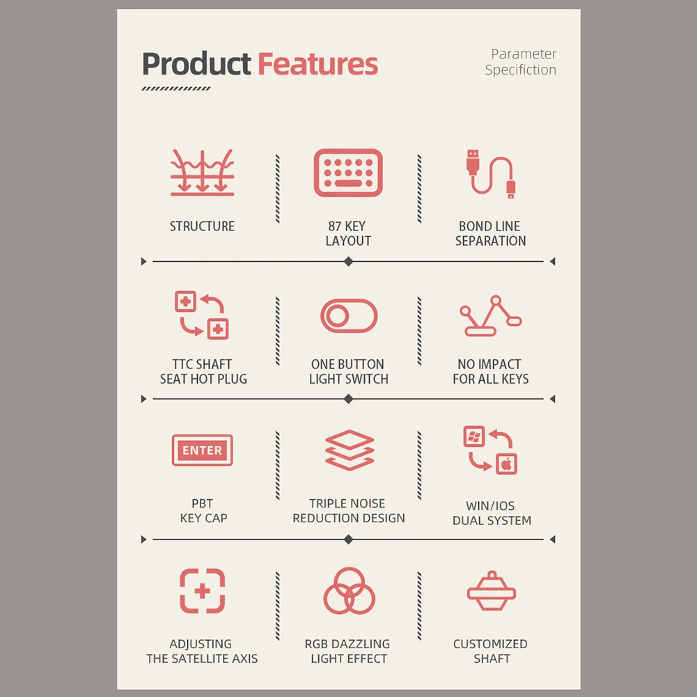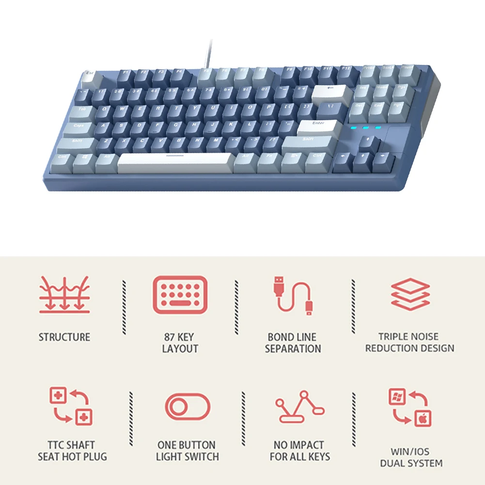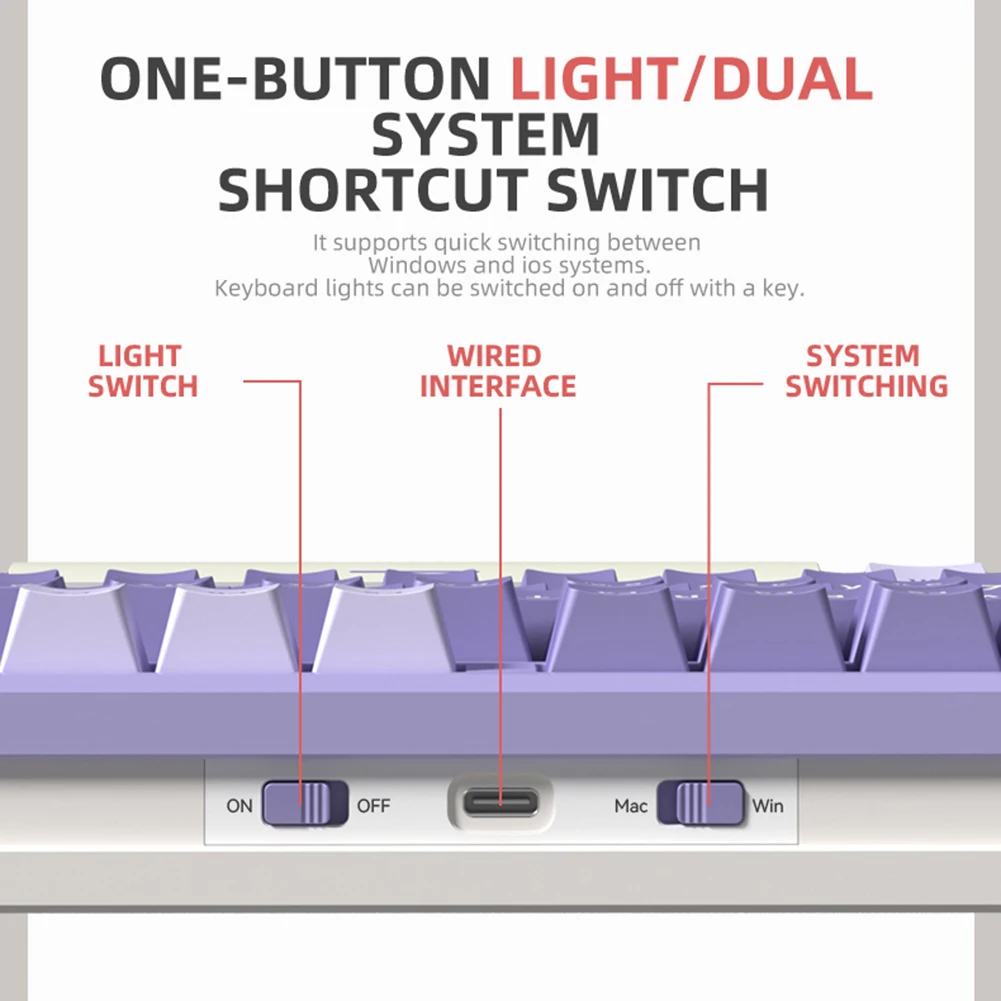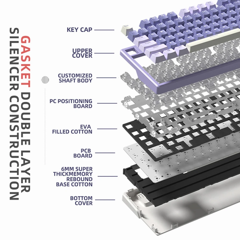 Feature: 1.Gasket Structure: This gaming keyboard features a gasket structure that absorbs keystroke vibrations through deformation, effectively suppressing high-frequency vibration and noise. 2.Dual-layer Silencing Material with EVA Foam Core: This wired keyboard is equipped with dual-layer silencing material and EVA foam core, reducing cavity resonance and improving typing consistency. Its unique combination of materials provides excellent soundproofing and shock absorption, ensuring quiet and precise keystrokes. Its memory foam core ensures that it retains its shape even after prolonged use, providing consistent performance over time. 3.High Rebound Memory Foam: This mechanical keyboard features high-density memory foam that offers exceptional soundproofing and shock absorption. Its high rebound rate allows it to quickly recover its shape after being compressed, providing consistent and reliable performance. Its dense and solid construction ensures that it can effectively reduce noise and vibration, making it perfect for gaming and professional use. 4.PC Material Positioning Plate: This wired gaming keyboard features a transparent PC positioning plate that provides superior flexibility and reduces low-frequency resonance. Its flexible design ensures that each keystroke is accurate and responsive, improving your overall gaming or typing performance. 5.One-key Switch and Backlit Lighting Control: This mechanical game keyboard supports Win and iOS systems and features one-key switch and backlit lighting control. Its user-friendly design allows you to quickly switch between different operating systems, saving you time and effort. Its backlighting allows you to create a unique and personalized gaming experience, providing a comfortable and immersive environment for long-term use. Specification: Note: