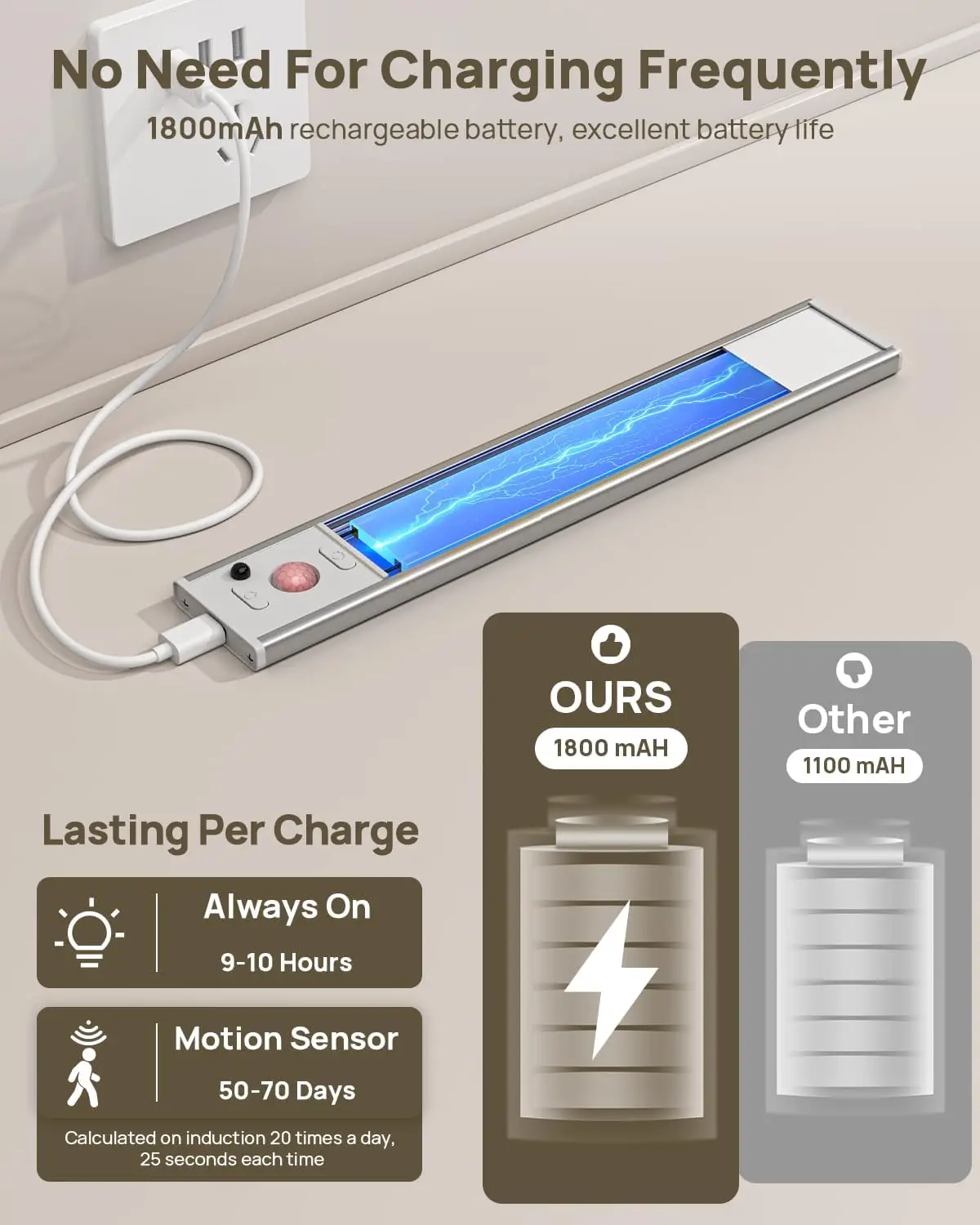 【Motion Identification Mode】The LED bar contains 4 modes: 1. Night identification mode: The lamp turns on only when the person is recognized in a dark environment; 2. Motion Identification Mode: Turns on when the person is recognized, regardless of day or night; 3. Always on mode: the light always stays on; 4. Off mode: the light is off. The cabinet light will last in “motion detection mode” 2-3 months.