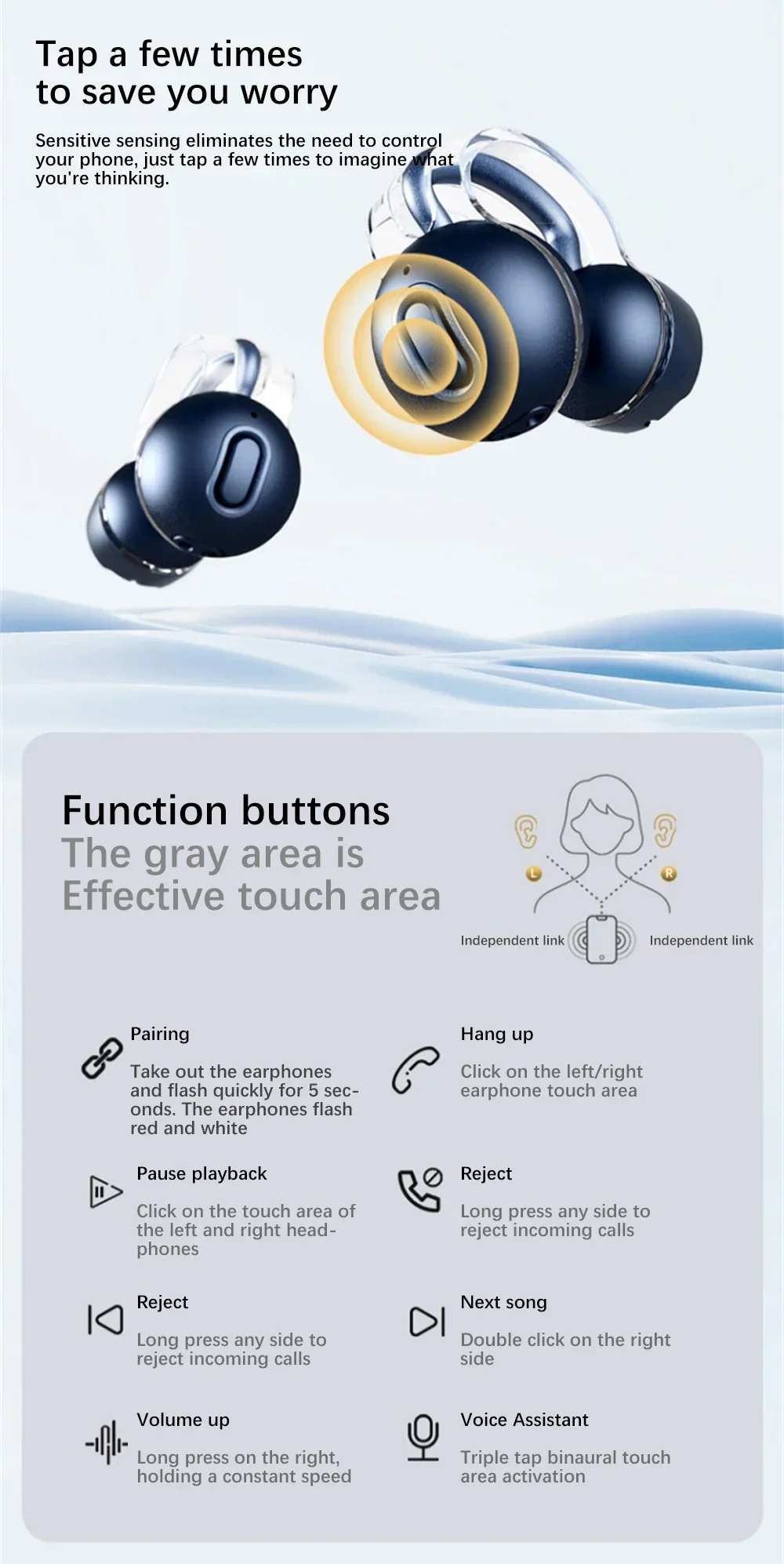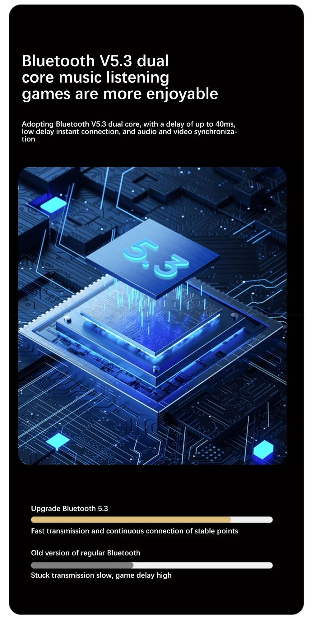 The upgraded Bluetooth 5.3 chip ensures a stable Bluetooth connection that will not be lost even in outdoor mixed signal environments. Feel the beauty of music, not only bring you high quality music, but also compatible with a variety of Bluetooth products, Bluetooth 5.3 wireless headphones, after the first pairing, the next time just open the charging case can be automatically connected. Simple one-hand operation “music play/pause, song forward, song backward, volume +/-, answer/end call/voice assistant”