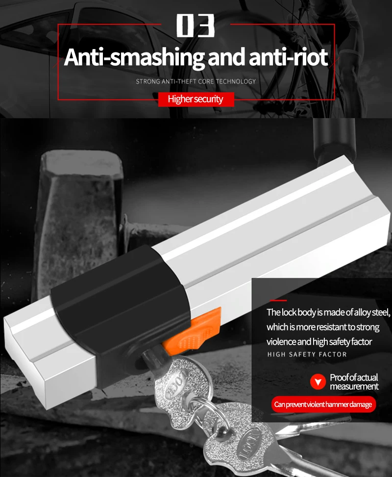 Bike lock features a hardened steel body and double-locking shackle for superior cutting and prying resistance.