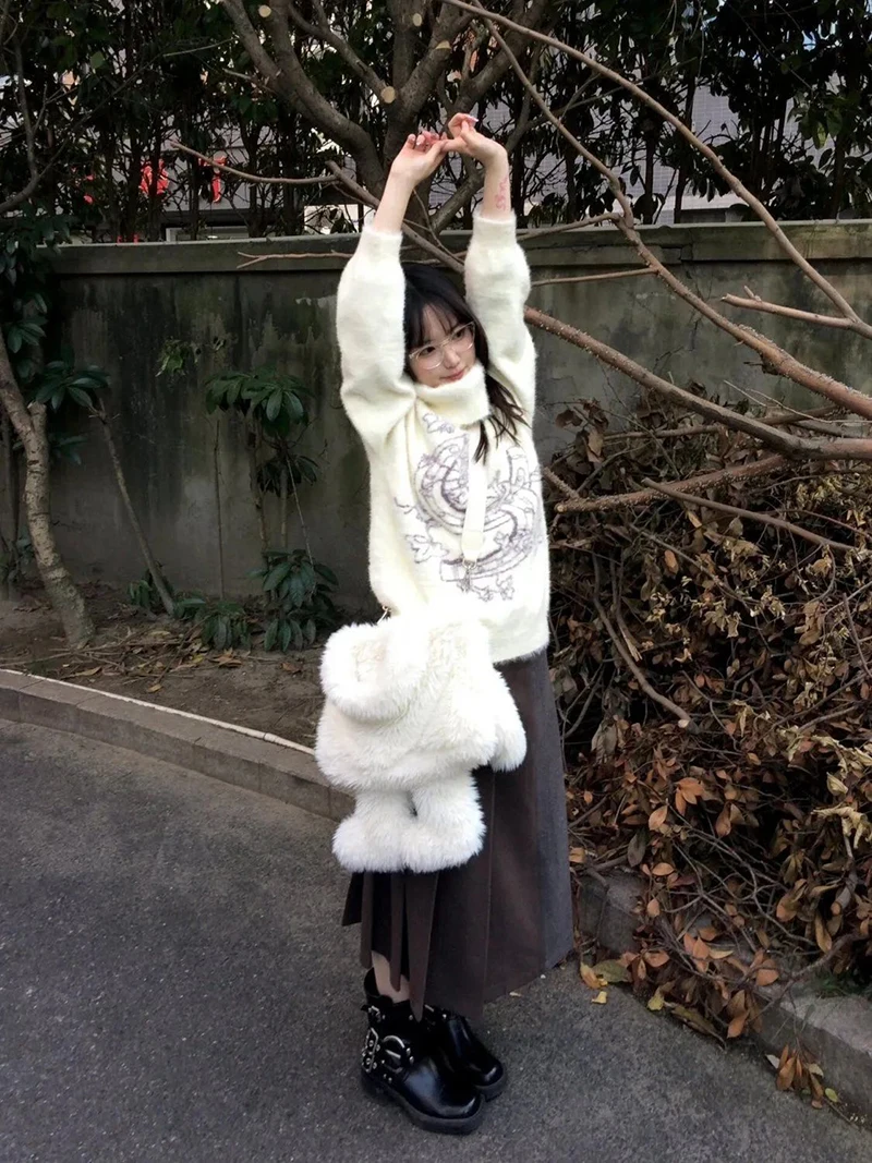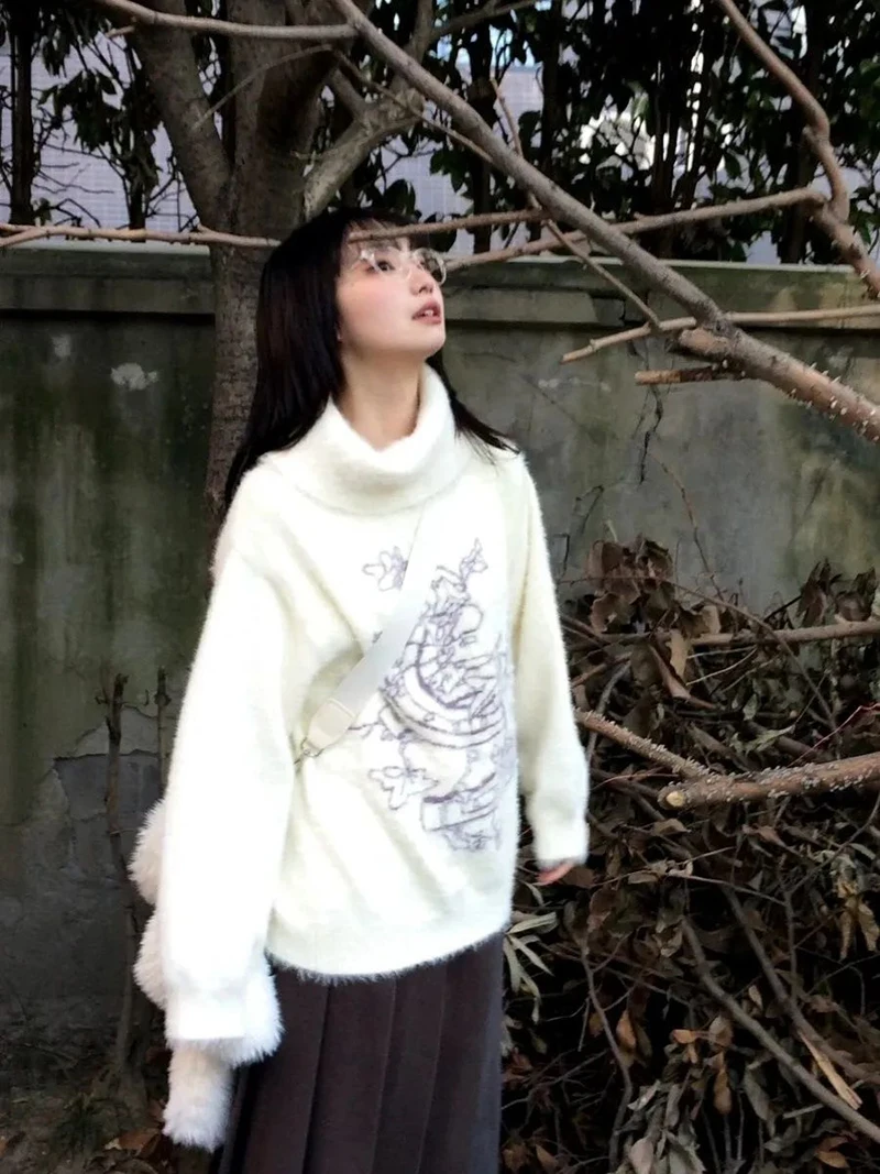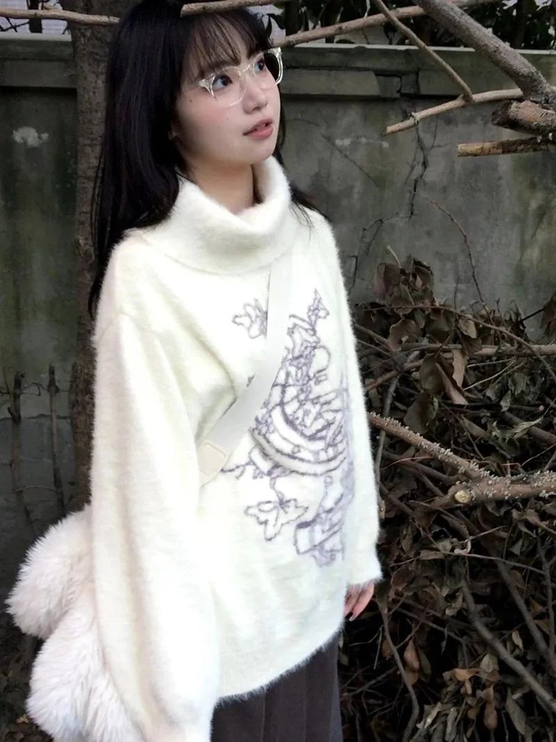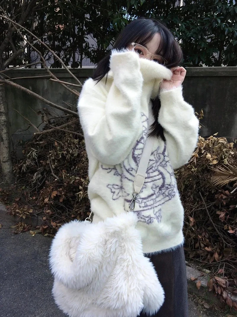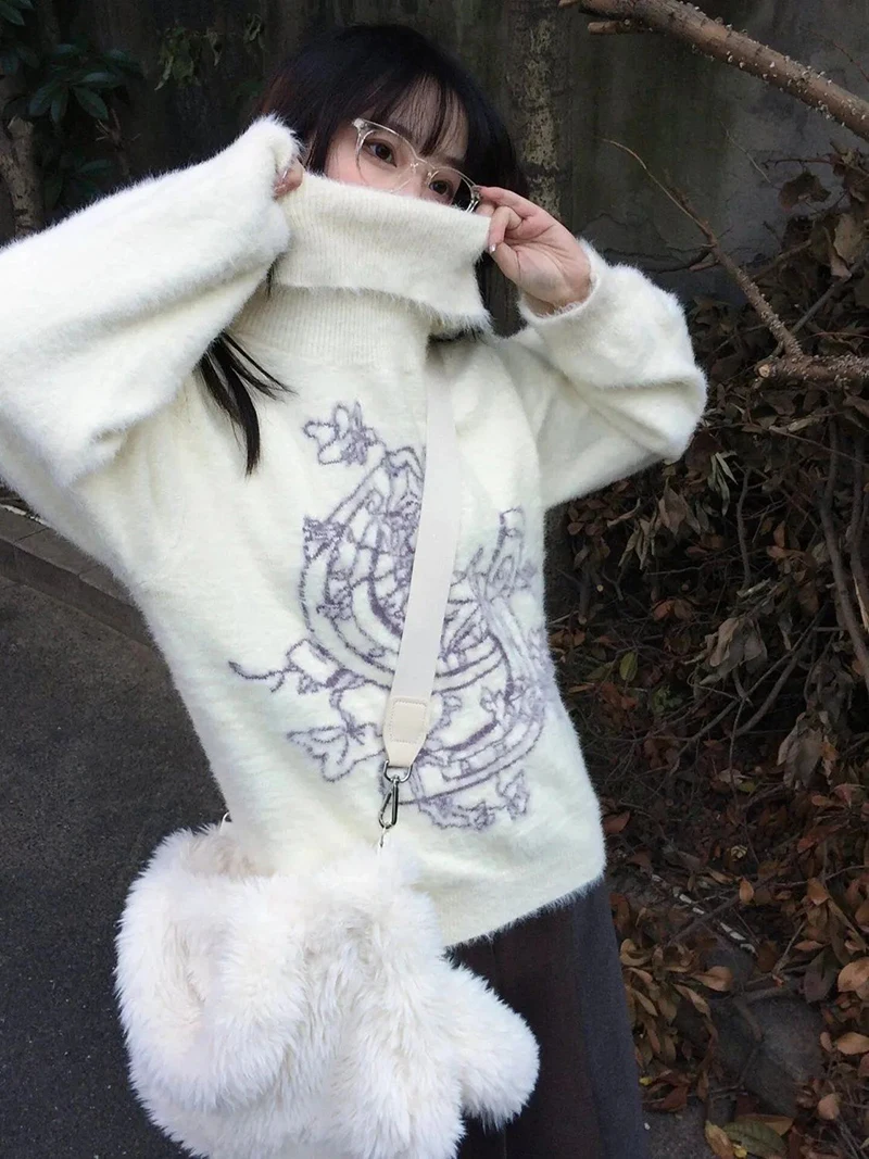 Y2K Turtleneck Sweater Women Harajuku Oversized Print Knitted Pullovers Japanese Aesthetic Knitwear Winter Long Sleeve Jumpers