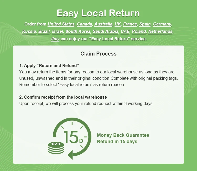 - Money back guarantee: Something not quite right? If you’re not totally satisfied with your purchase, you can return it within 15 days for a full refund