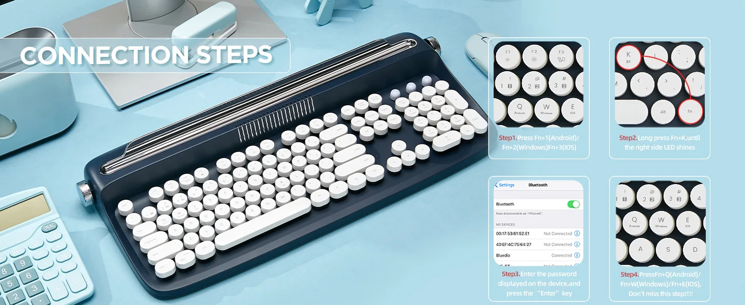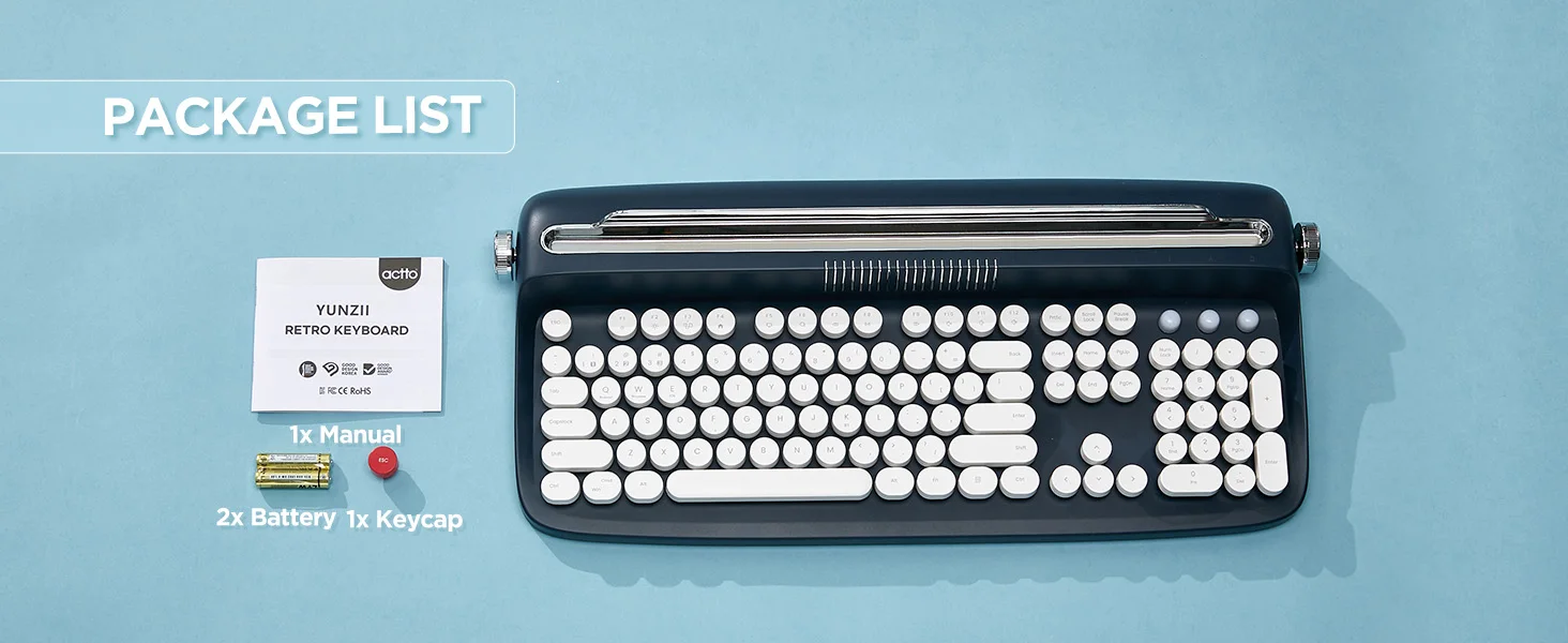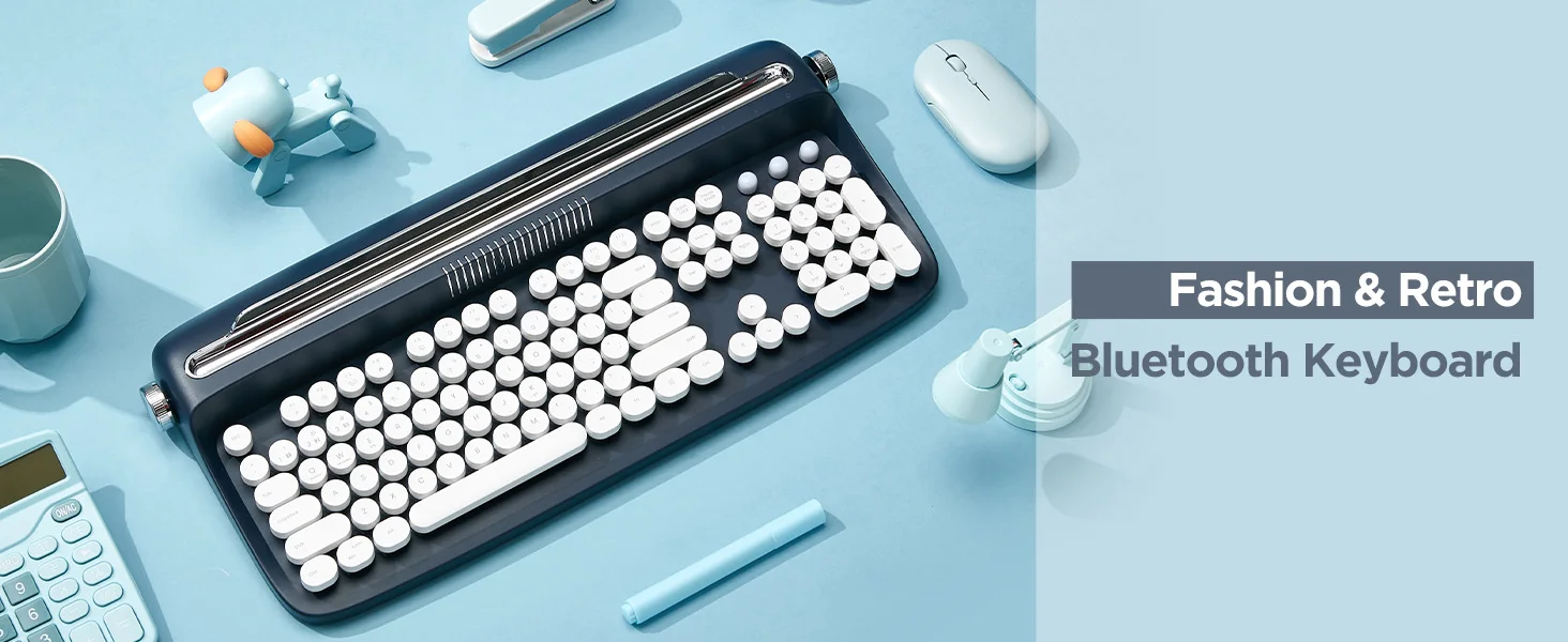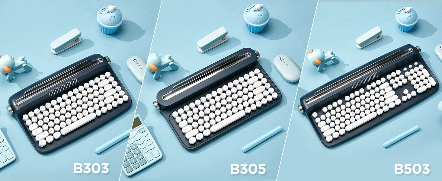 The cute B503 retro keyboard holds 104 keys. Different from the B303 and B305 which holds 84 keys, the B503 is a full layout Bluetooth keyboard that holds numpad.