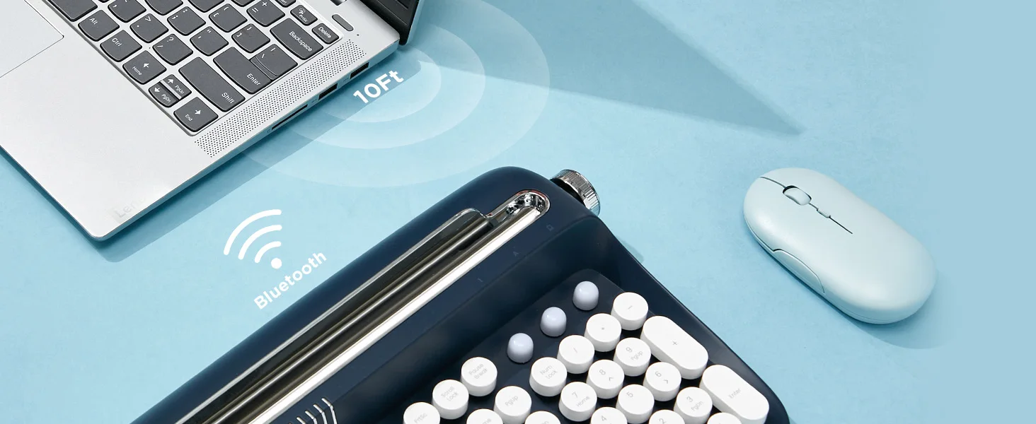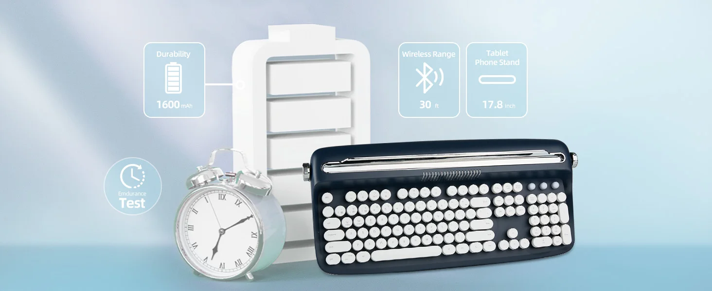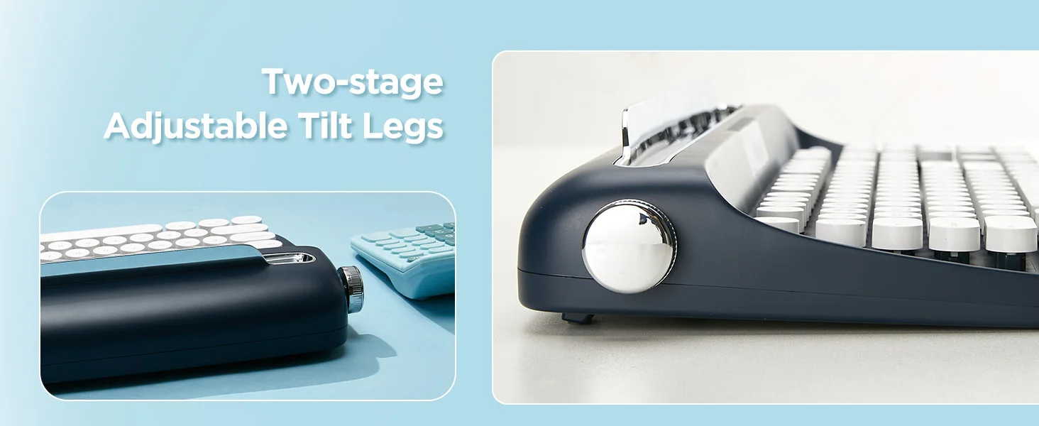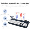 The cute B503 retro keyboard holds 104 keys. Different from the B303 and B305 which holds 84 keys, the B503 is a full layout Bluetooth keyboard that holds numpad.