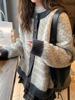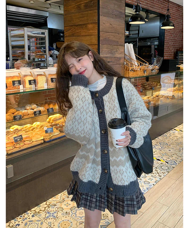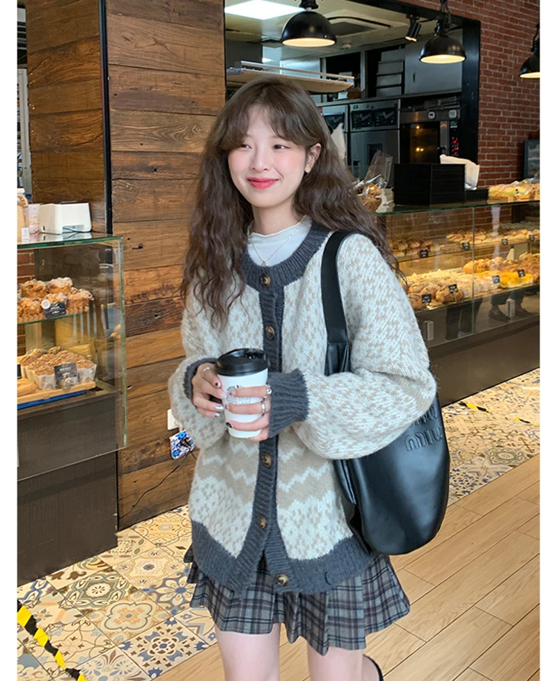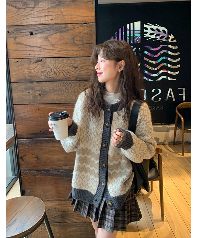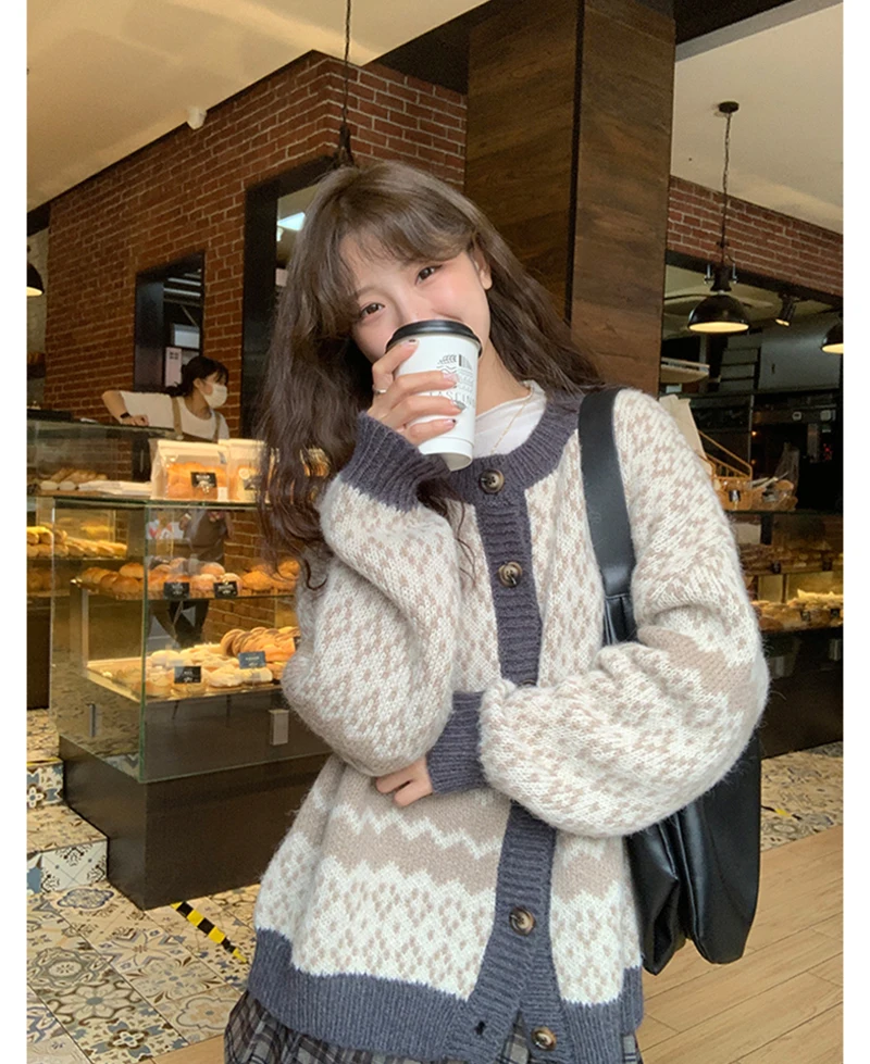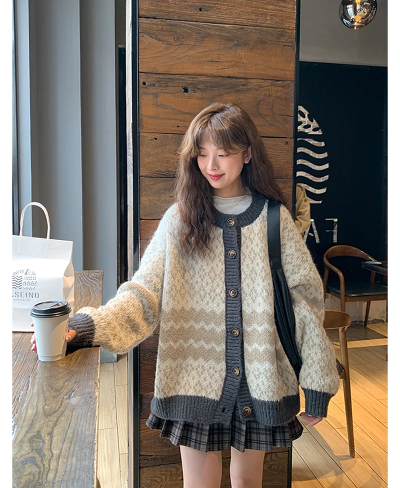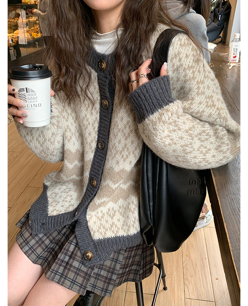 Zoki Vintage Argyle Cardigan Sweaters Women O Neck Loose Casual Preppy Style Knitted Coat Korean Oversize Long Sleeve Retro Tops